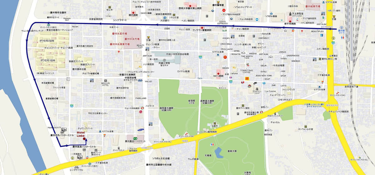 從慶州火車站往Motel Liebe步行路線圖