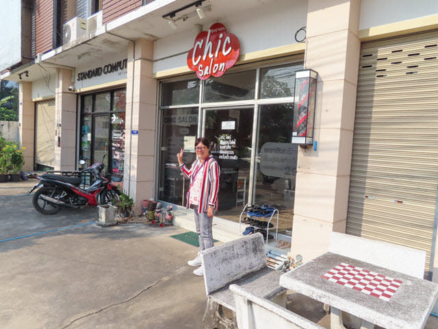 她堅持要今天理髮,唯有在街道四處亂走亂碰, 最後花了四十五分鐘才找到一間像樣的理髮店,店舖的名稱叫 Pimploy Salon。剛才沿街道左穿右插, 拐了無數個彎, 這間理髮廳竟然就在我們下榻酒店的下一個街口!